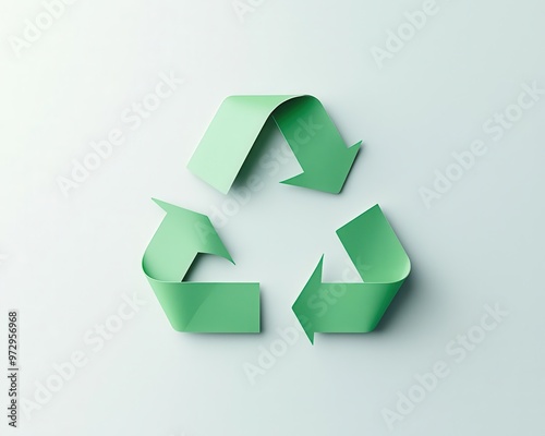 © Creator88, Obraz premium Recycle symbol made from soft green paper, centered on a light grey background, clean and minimalist