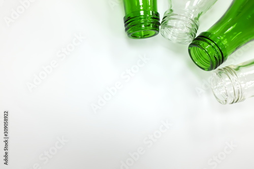 © sulit.photos, Fototapeta premium Recycled glass bottles in white background showing plastic free concept