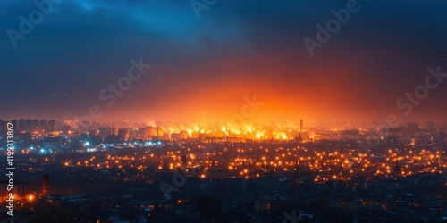 © เด็กชาย นุ่มนิ่ม, Naklejka premium recycling carbon climate transformation concept. Vibrant city skyline illuminated at night with glowing lights and a dramatic sky backdrop.