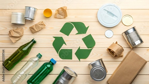 © WisChi, Obraz premium Recycling Concept Assorted Recyclable Materials with Green Recycle Symbol on Wooden Background