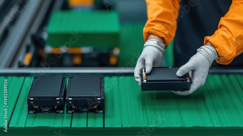© Omias, Obraz premium Recycling Plant Workers Sorting Electronics on Conveyor Belt Concept, Close-Up of Worker Removing Lithium Battery from Assembly Line with Focus on Safety and Precision