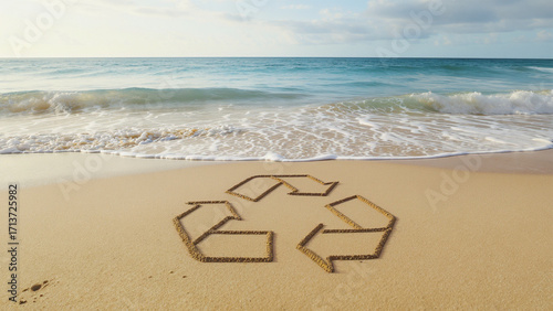 © TOY, Naklejka premium Recycling symbol drawn on sandy beach near ocean waves under cloudy sky, inspiring environmental care and hope