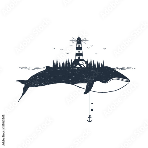 © SlothAstronaut, Obraz premium Ręcznie rysowane odznaka żeglarska z teksturą ilustracji wektorowych latarni morskiej i wieloryba.