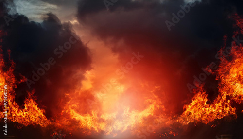 © Chitsanupong, Naklejka premium Red abstRed abstract fire background dramatic sky with clouds. Fire, war, explosion, catastrophe, flame. Horror concept.Vivid and hot hell abstract or blazing fire wallpaper.AI Generative