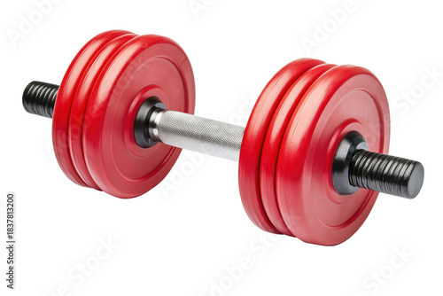 © mahatabuddin, Naklejka premium Red adjustable dumbbell with chrome handle isolated on transparent background. Dumbbell in vibrant red color isolated on white background.