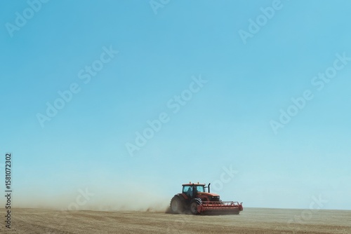 © Алена Ваторина, Fototapeta premium Red agricultural tractor plowing a vast field under a clear blue sky, creating a cloud of dust, showcasing the farming process and rural landscape in action