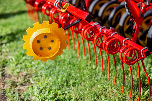 Fototapeta premium Red agriculture farming tractor for soil recurment close up of red parts of...