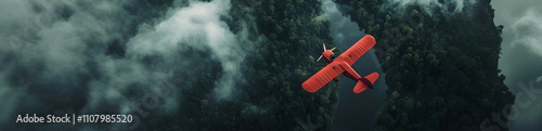 © W.O.W, Fototapeta premium Red airplane flies over river bed. Top view of dark green forest panorama. banner copyspace