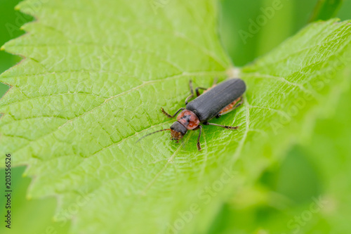 © Zoran, Fototapeta premium Red and black beetle crawling on green leaf