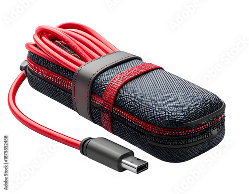 © Use full Image, Fototapeta premium Red and black braided USB Type C charging cable with case.
