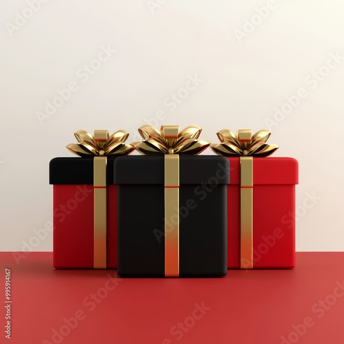 Obraz premium Red and black Christmas gift boxes with golden ribbons, 3D illustration