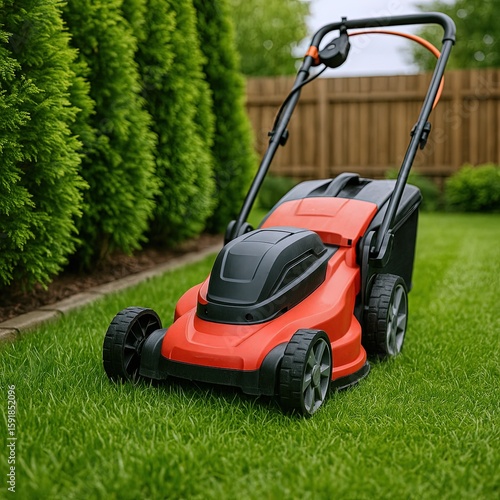 © Generative AI, Fototapeta premium Red and black electric lawn mower on green grass with wooden fence and hedge background.