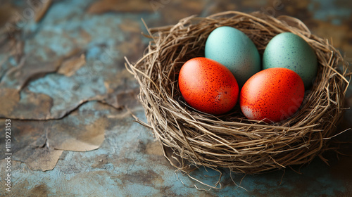 © Hanna, Fototapeta premium Red and Blue Easter Eggs in a Nest on a Dark Background with Space for Text