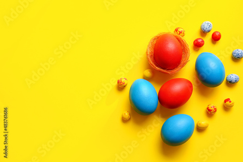 © Pixel-Shot, Obraz premium Red and blue Easter eggs on color background