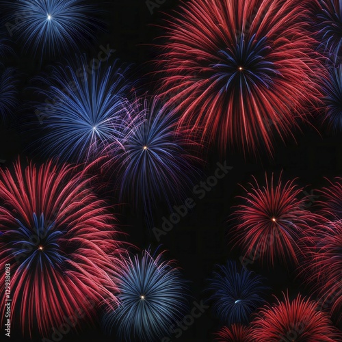 Naklejka premium Red and blue fireworks bursting against a dark backdrop, creating a vibrant...