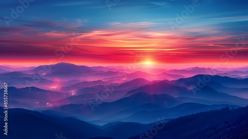 Fototapeta premium Red and blue gradient sky mountains illustration poster background