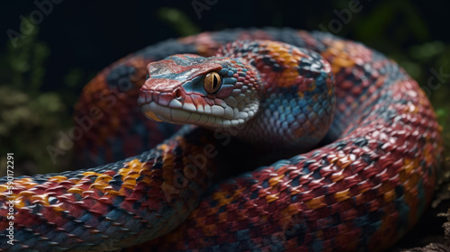 Fototapeta premium Red and blue snake portrait in dark, generative ai