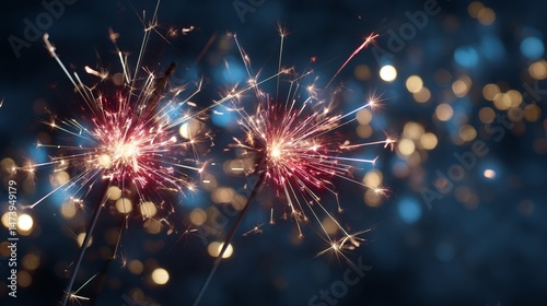 Fototapeta premium Red and blue sparklers glow with golden embers, soft fireworks in the...