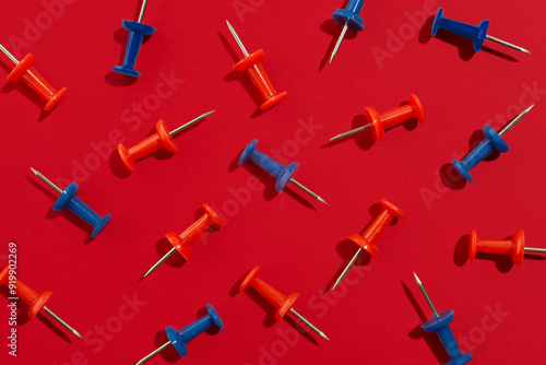 © Anna, Naklejka premium Red and blue stationery pins on red background. Back to school concept