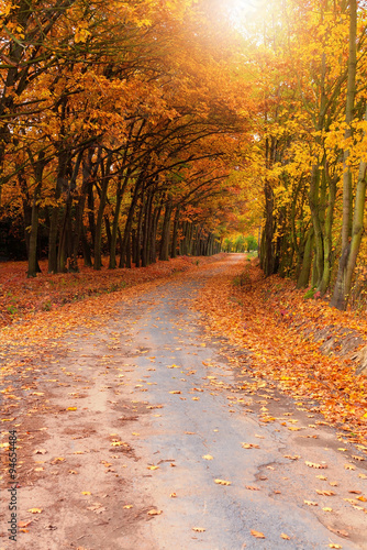 Obraz premium Red and colorful autumn colors in the forest with a road