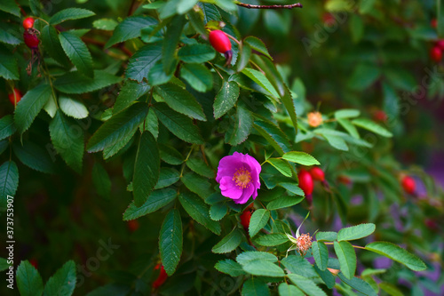 Obraz premium Red and delicate rosehip flowers with berries on a green Bush
