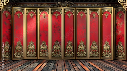 © AI_Nusantara, Obraz premium Red and gold Chinese room divider screen.