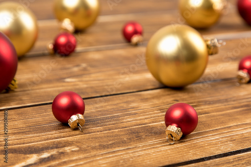 © Nicole Lienemann, Naklejka premium red and gold christmas balls on a wooden background