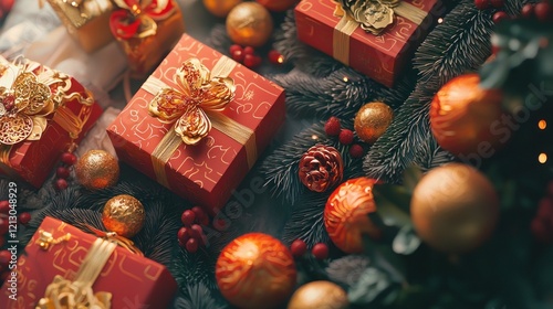 Naklejka premium Red and gold Christmas gifts, ornaments, and pine branches on a table.
