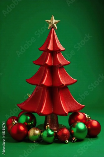 © Janmo, Naklejka premium Red and gold Christmas tree on a green table with surrounding ornaments, tree, holiday, table