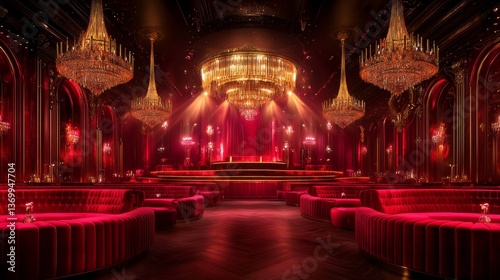 Obraz premium Red And Gold Nightclub Interior With Crystal Chandeliers And Plush Seating