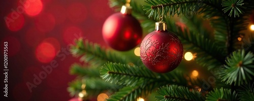 © Yasotaro, Fototapeta premium Red and gold ornaments hang from a Christmas tree branch, tree ornaments, red gold christmas tree ornaments, golden accents