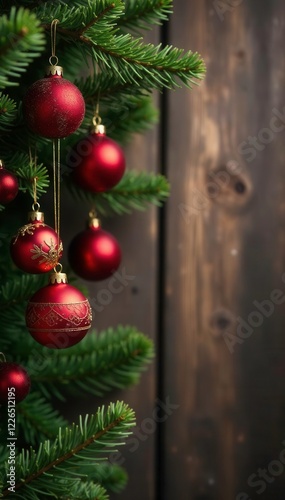 Fototapeta premium Red and gold ornaments hang from fir branch on a rustic wooden wall,...