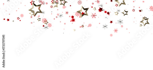 Fototapeta premium Red and gold stars, snowflakes falling on white. Festive, celebratory, magical.