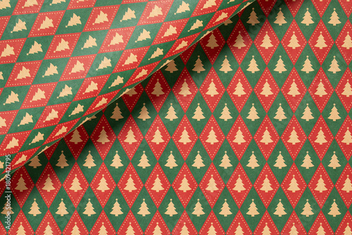 © Cool-Hunter, Naklejka premium Red and green Christmas background with geometric and christmas trees,seamless pattern of christmas trees and snowflakes background,Christmas wrapping paper, Xmas pattern with ornaments.
