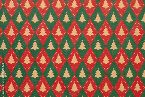 Fototapeta premium Red and green Christmas background with geometric and christmas trees,seamless pattern of christmas trees and snowflakes background,Christmas wrapping paper, Xmas pattern with ornaments.