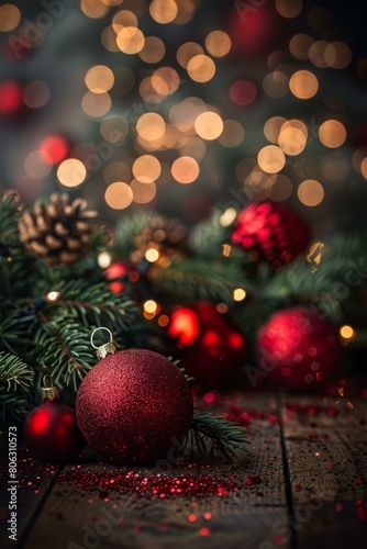 © Adobe Contributor, Obraz premium Red and green Christmas ornaments on a wooden table