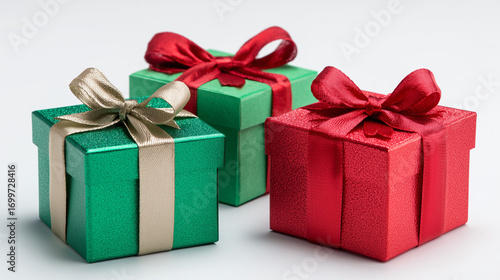 © Nain, Fototapeta premium Red and green gift boxes with bows on white background -