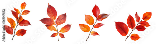 Fototapeta premium Red and orange autumn leaves on branch against isolated on a white or transparent background, Cut out PNG