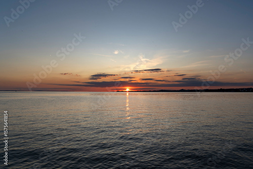 © Oliver Dünser, Naklejka premium red and orange sunset over Lake Constance and the island of Lindau in Germany with beautiful clouds seen from the Austrian coastline in Bregenz