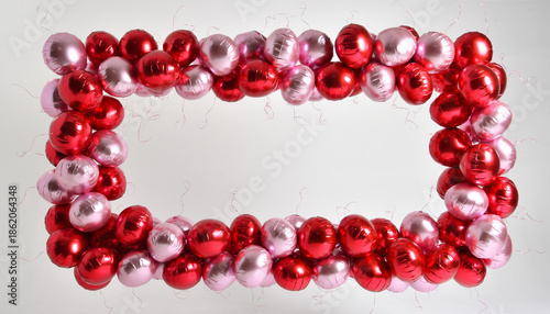 Obraz premium Red and pink metallic balloons arranged in a rectangular frame shape.
