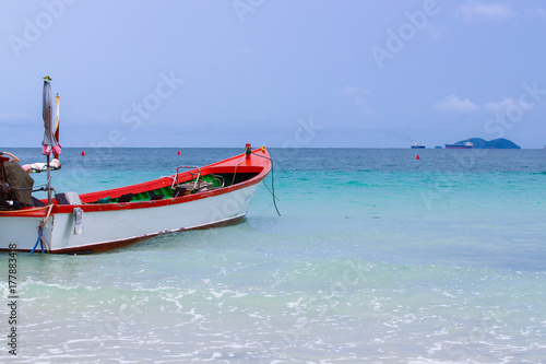 Fototapeta premium Red and white boat parked near the beach. thailand