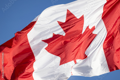 Fototapeta premium Red and white Canadian flag with a maple leaf waving in the air in downtown...