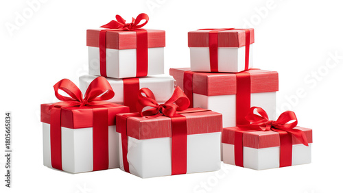 Obraz premium Red and White Christmas Gift Boxes Stack, Featuring Smooth Satin Ribbons and Clear Focus. Modern Commercial Lighting, Isolated on White.