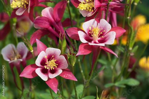 Fototapeta premium Red And White Columbine Flowers In Spring