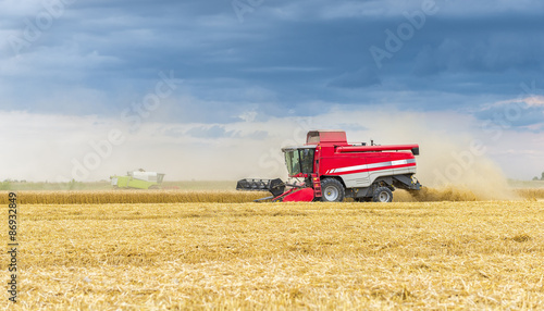 © caluian, Obraz premium Red and white combine harvesting
