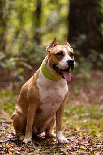 Obraz premium Red and white dog walks outdoor at summer