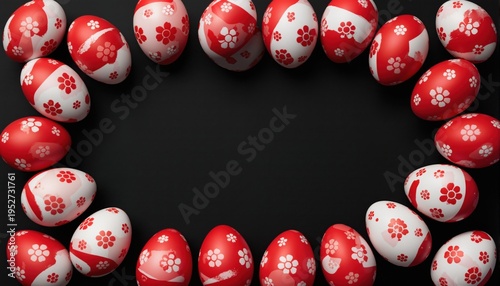 © Konstantin, Obraz premium Red and white easter eggs on a black background. Space for text.