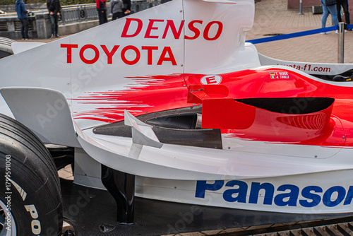 Naklejka premium Red and white Formula 1 Toyota TF-108 car with blue and yellow accents, showcasing sponsor logos DENSO, TOYOTA, PANASONIC Sleek design highlighted by streamlined bo - Kyiv, Ukraine 10-10-2024