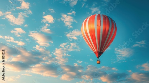 © hazia, Naklejka premium Red and White Hot Air Balloon Soaring Through a Blue Sky