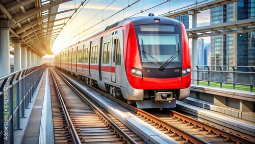 © Sayfar, Naklejka premium Red and white Jabodebek LRT train on track travels past cityscape